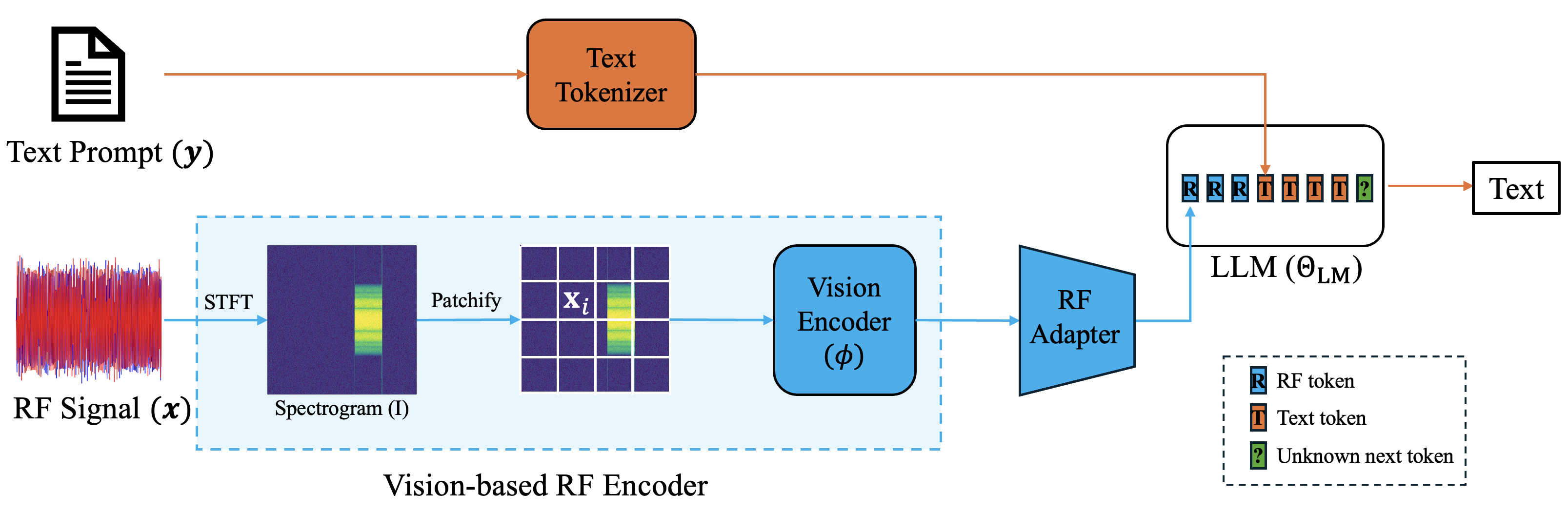 - Vision encoder: a pretrained ViT partitions the spectrogram into $14 \times 14$ patches, producing 1,369 RF tokens